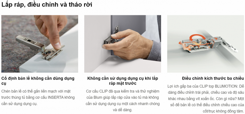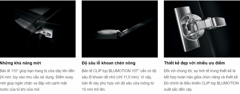 Blum cung cấp hệ thống bản lề đa dạng cho mọi loại cửa tủ có chiều cao, độ dày và chất liệu khác nhau. Tất cả hệ thống bản lề của Blum đều vượt trội về công năng, đảm bảo về chất lượng và dễ dàng lắp đặt, điều chỉnh