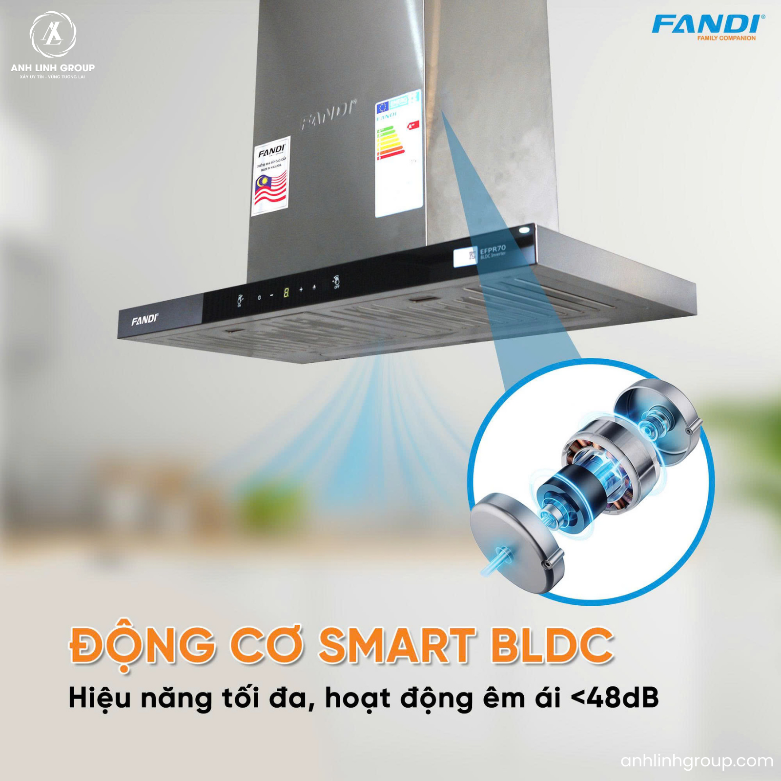 Độ ồn tối thiểu: Động cơ BLDC hoạt động êm ái hơn do không có sự ma sát giữa chổi than và roto. Điều này khiến máy hút mùi Fandi EFPR70/90 hoạt động với độ ồn chỉ <45dB, tạo ra môi trường làm việc thoải mái hơn cho người sử dụng