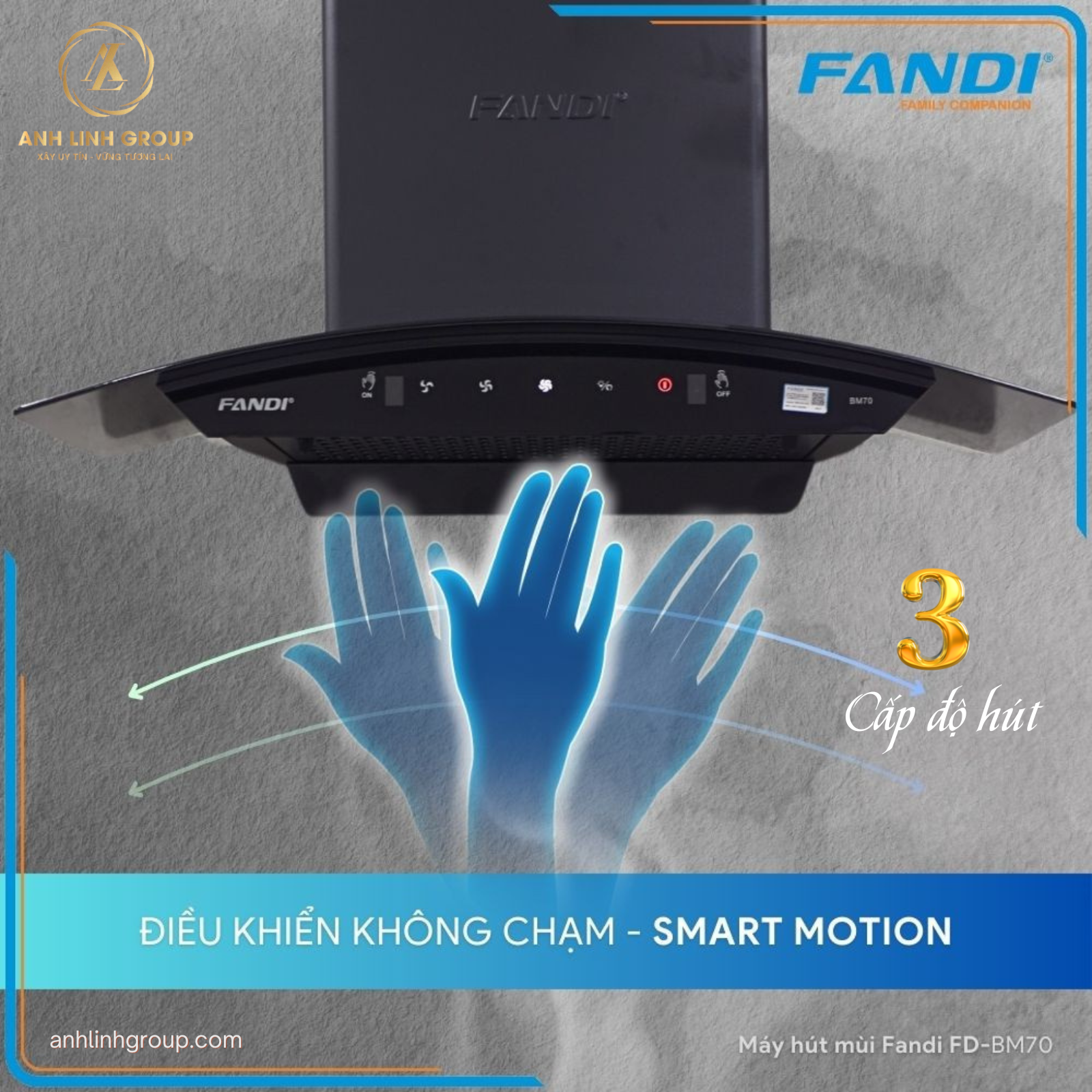 Hơn 10 năm nghiên cứu & sản xuất thiết bị nhà bếp phục vụ người Việt, Fandi thấu hiểu thói quen của người nội trợ, công nghệ Smart Motion ưu việt cho phép điều khiển máy hút mùi FD-BM70 dễ dàng chỉ với những cử chỉ tay, hoàn toàn không chạm. Mạch điều khiển lập trình thông minh kết hợp cảm biến Light Sensor mới giúp BM70 nhận diện nhanh nhạy những cử chỉ tay qua lại của người sử dụng.